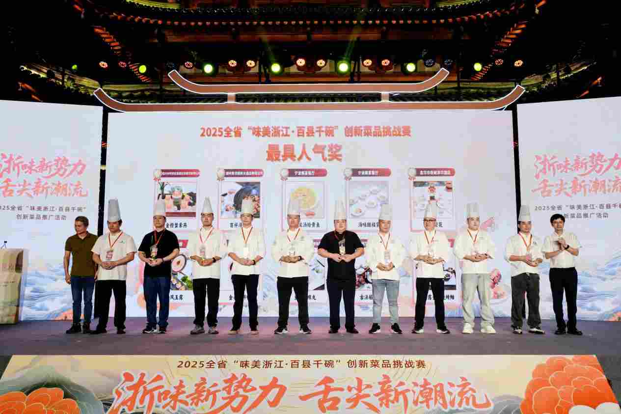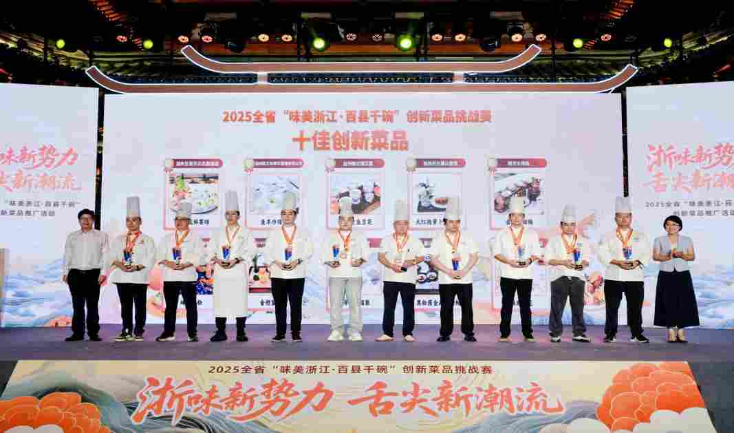 《十佳创新菜品》颁奖现场 左六为郑建斌 丽水开放大学供图