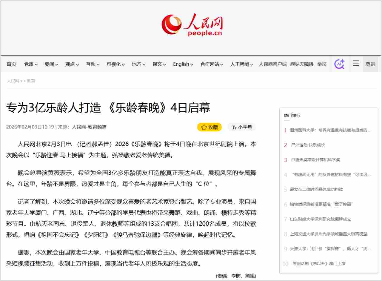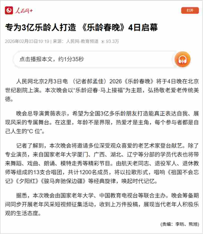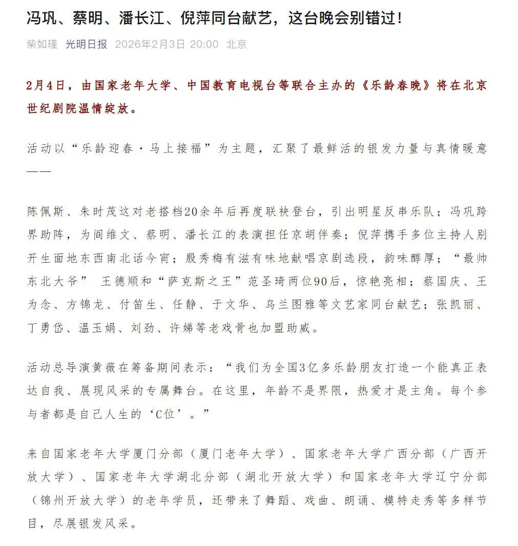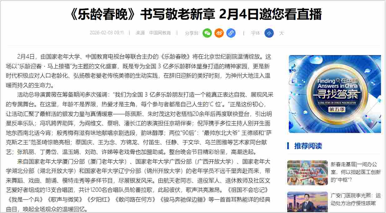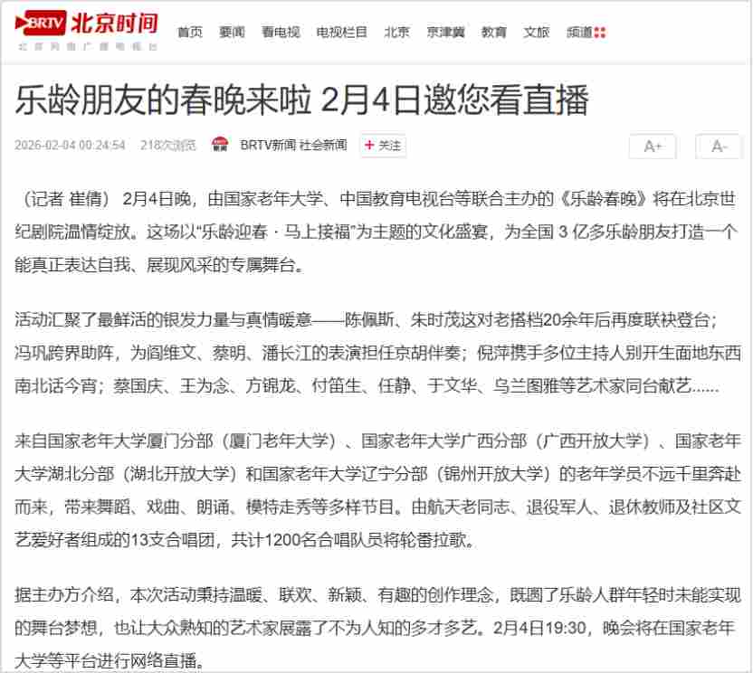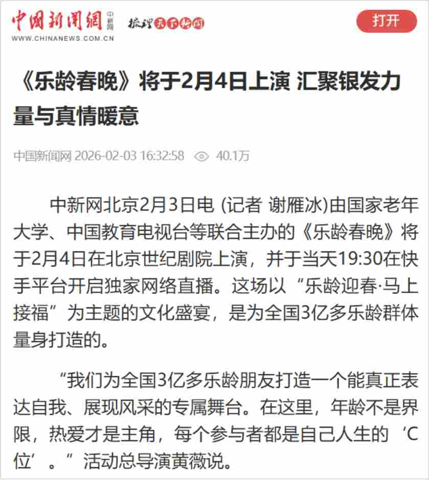2月4日恰逢立春,春启新程、福伴安康,由国家老年大学、中国教育电视台、北京曜阳公益基金会联合主办,以“乐龄迎春·马上接福”为主题的2026“乐龄春晚”在北京世纪剧院温情绽放。通过打造专属乐龄群体的新春盛宴,彰显新时代“银龄少年”的活力与风采。