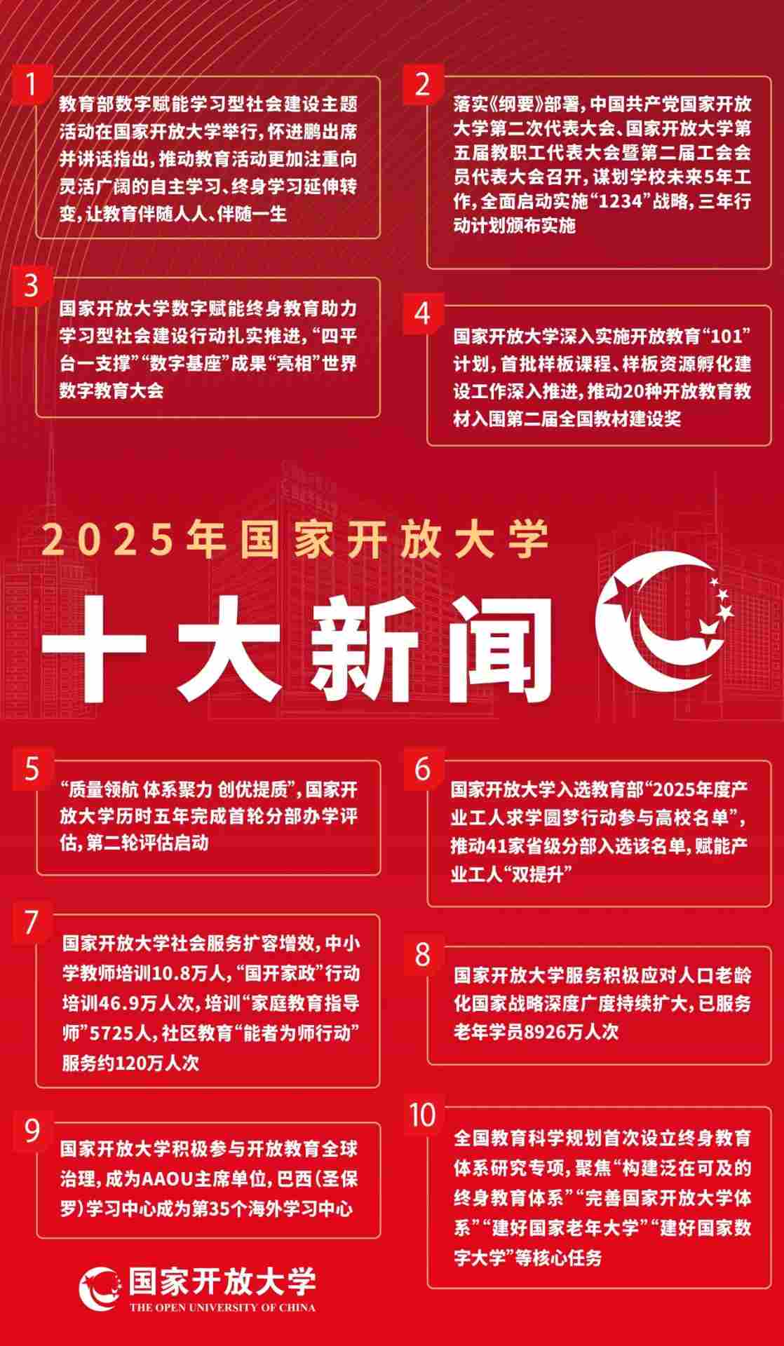 为贯彻落实《教育强国建设规划纲要(2024—2035年)》部署要求,国家开放大学分别于4月9日、6月20日召开第五届教职工代表大会暨第二届工会会员代表大会第一次会议、中国共产党国家开放大学第二次代表大会,谋划学校未来5年工作,全面启动实施“1234”战略(“一条主线”,以数字赋能终身教育服务学习型社会、学习型大国建设为战略主线;“双轮驱动”,坚持学历教育和非学历教育并重;“三张名片”,扩优提质开放教育、做优做强老年大学、探索创建数字大学;“四个平台”,建成我国终身教育的主要平台、在线教育的主要平台、老年教育的主要平台和对外合作的重要平台)。8月19日,按照中央教育工作领导小组《加快建设教育强国三年行动计划(2025—2027年)》部署要求,《国家开放大学(国家老年大学)贯彻落实教育强国建设规划纲要三年行动计划(2025—2027年)》颁布,启动实施开放大学新时代立德树人工程、扩优提质开放教育综合改革创新工程、做优做强国家老年大学建设工程、研究创建数字大学工程等十大工程。