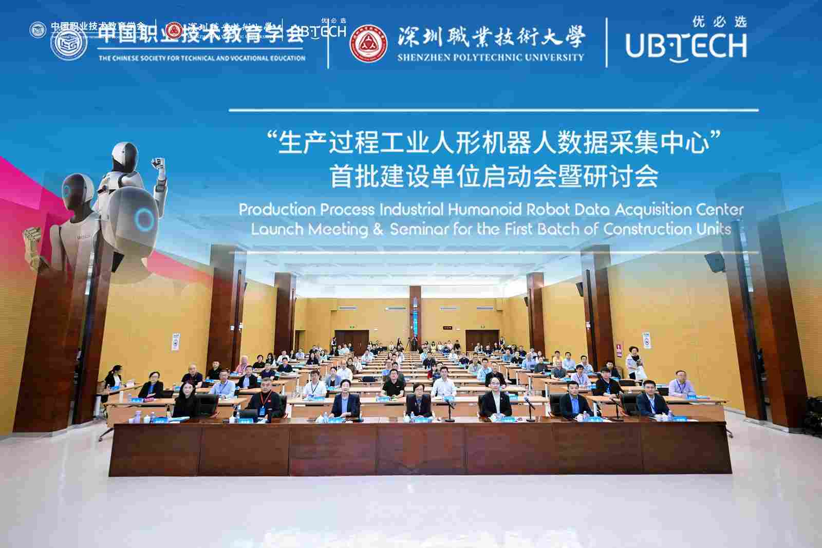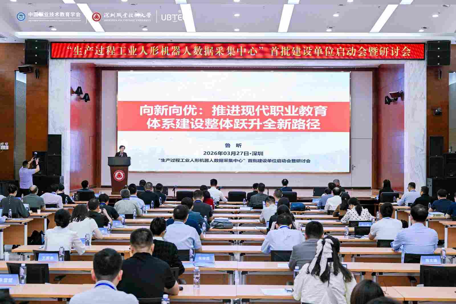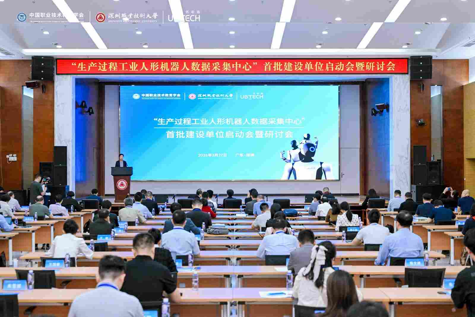 3月27日,“生产过程工业人形机器人数据采集中心”首批建设单位启动会暨研讨会在深圳职业技术大学召开。中国职业技术教育学会(以下简称学会)会长、教育部原副部长鲁昕,学会副会长宋敏,学会副会长、北京市丰台区职业教育中心学校校长赵爱芹,深圳职业技术大学党委副书记、校长许建领,深圳职业技术大学党委委员、副校长李小元,深圳市优必选科技股份有限公司(以下简称优必选科技)高级副总裁钟永,优必选科技副总裁兼研究院院长焦继超,优必选科技执行董事兼人力资源副总裁刘明等出席会议。会议由宋敏主持。来自数采中心建设院校、高水平大学、相关企业的100余名专家学者、代表参加会议。
