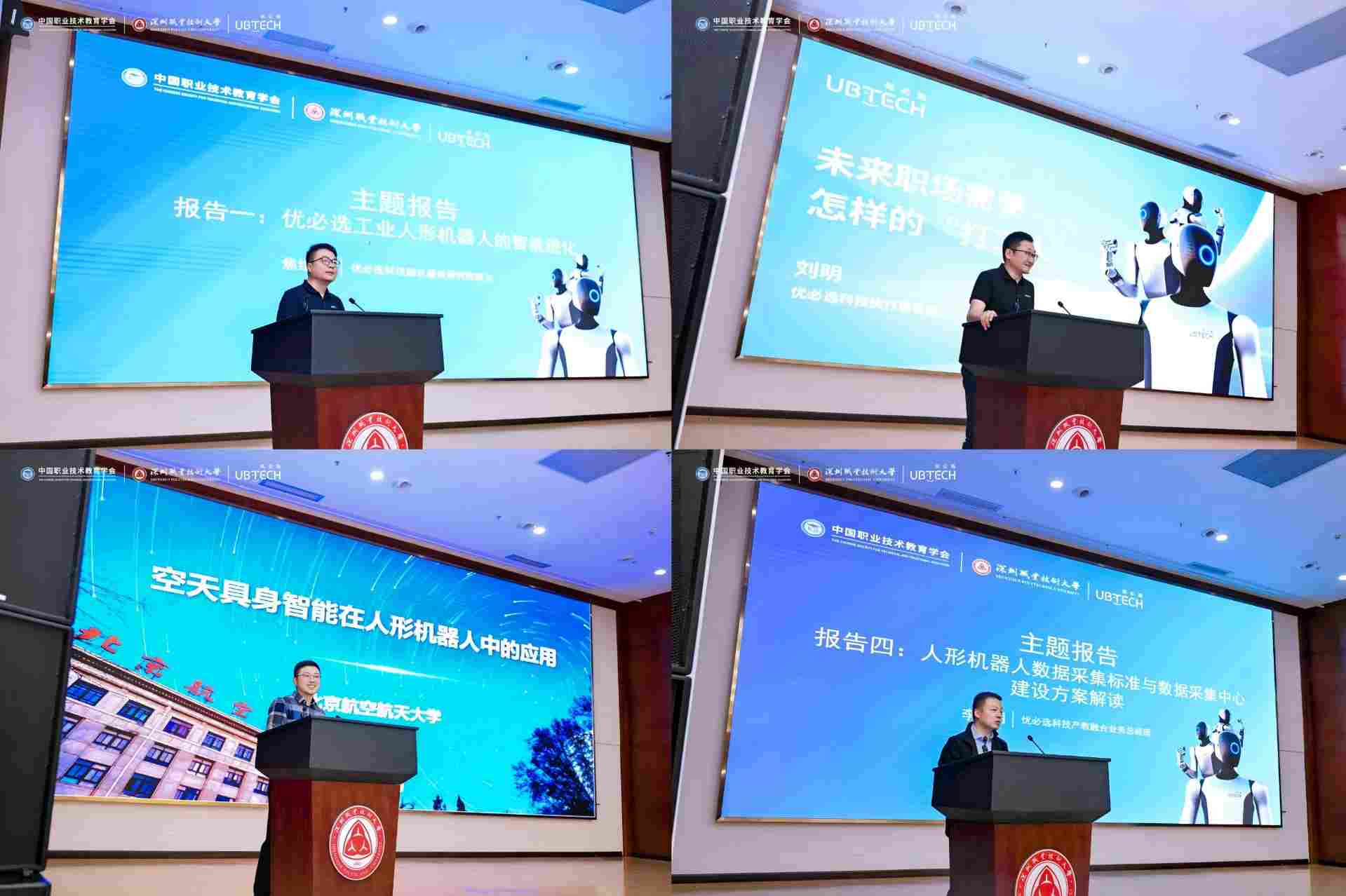 优必选科技副总裁兼研究院院长焦继超,优必选科技执行董事兼人力资源副总裁刘明,北京航空航天大学空天具身智能联合实验室副主任王学运,优必选科技产教融合业务总经理李晓明分别围绕工业人形机器人的技术演进、产业发展对人才培养的新要求、空天具身智能前沿发展以及数采中心建设路径解读等内容作主题报告。